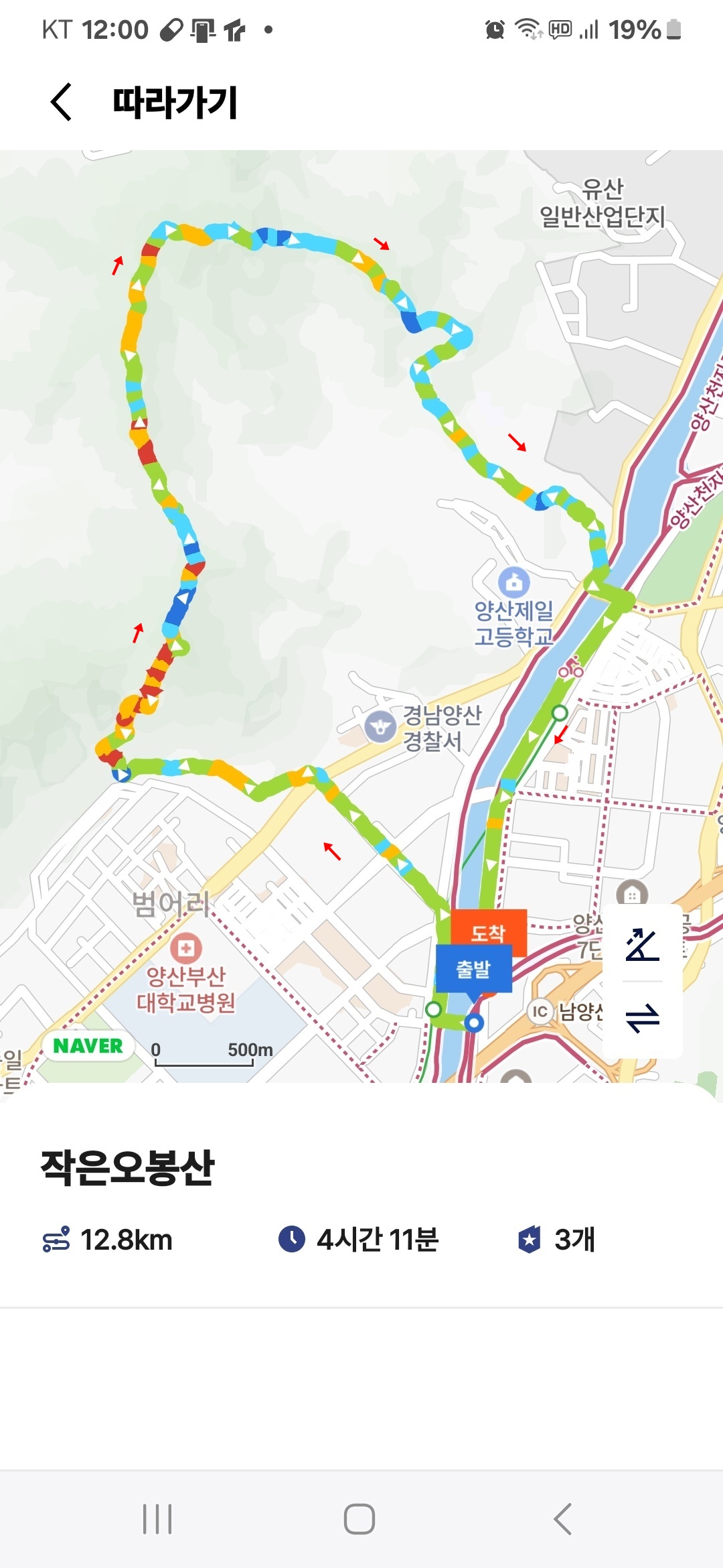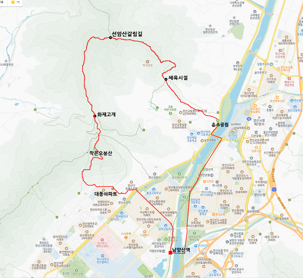 코스:남양산역-더포레스트아파트-관음사-체육시설-작은오봉산-화재고개-475봉-선암산갈림길-갈림길삼거리-체육시설-충열사-춘공원-영대교-양산역-남양산역