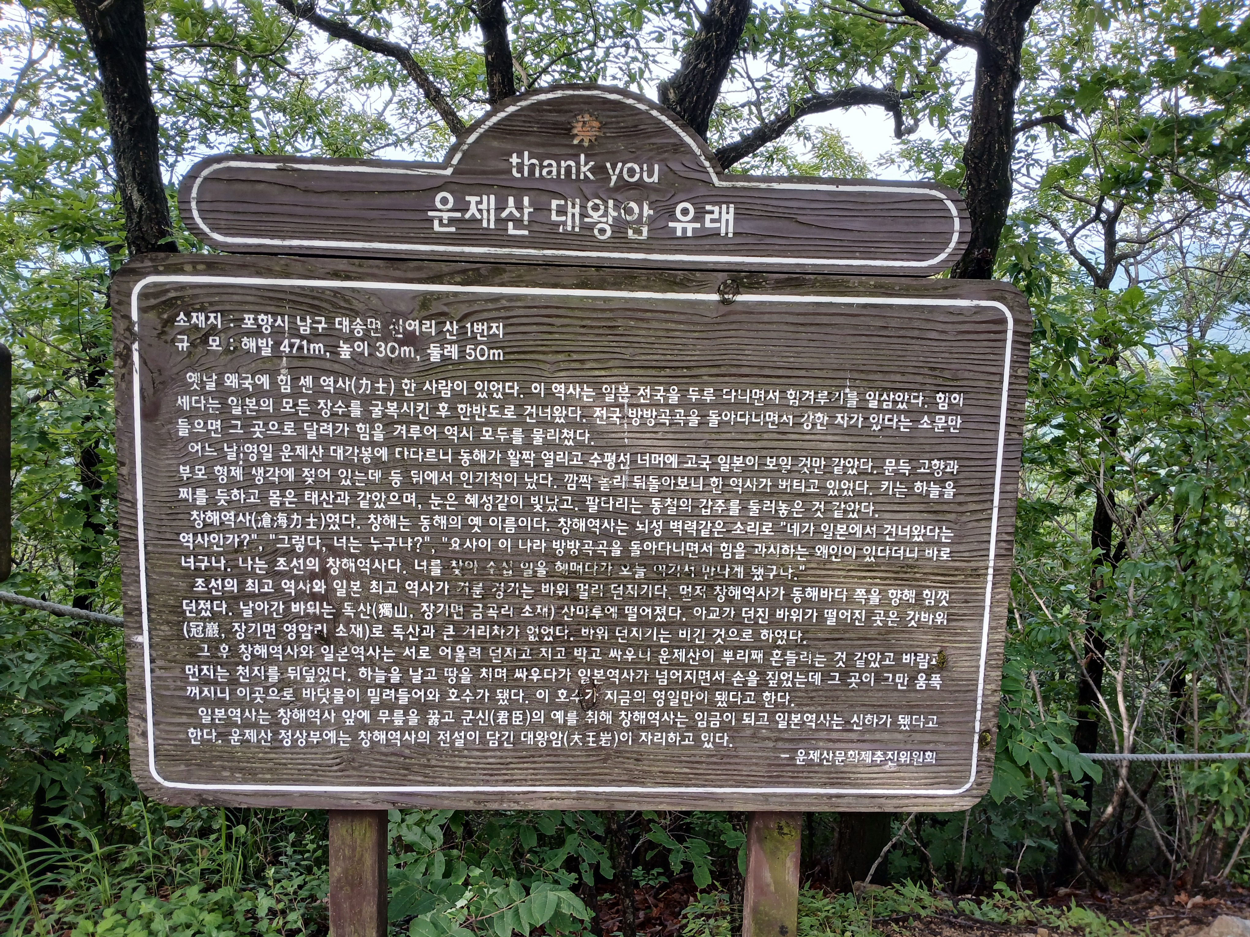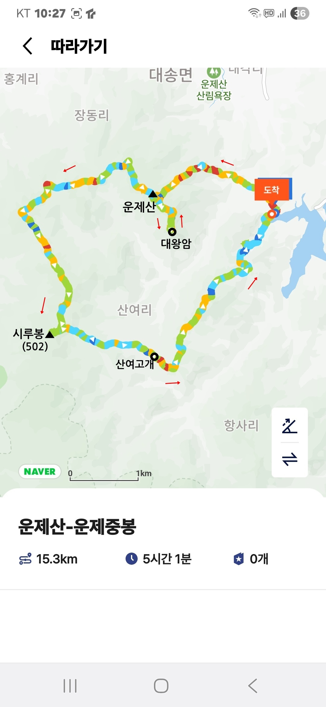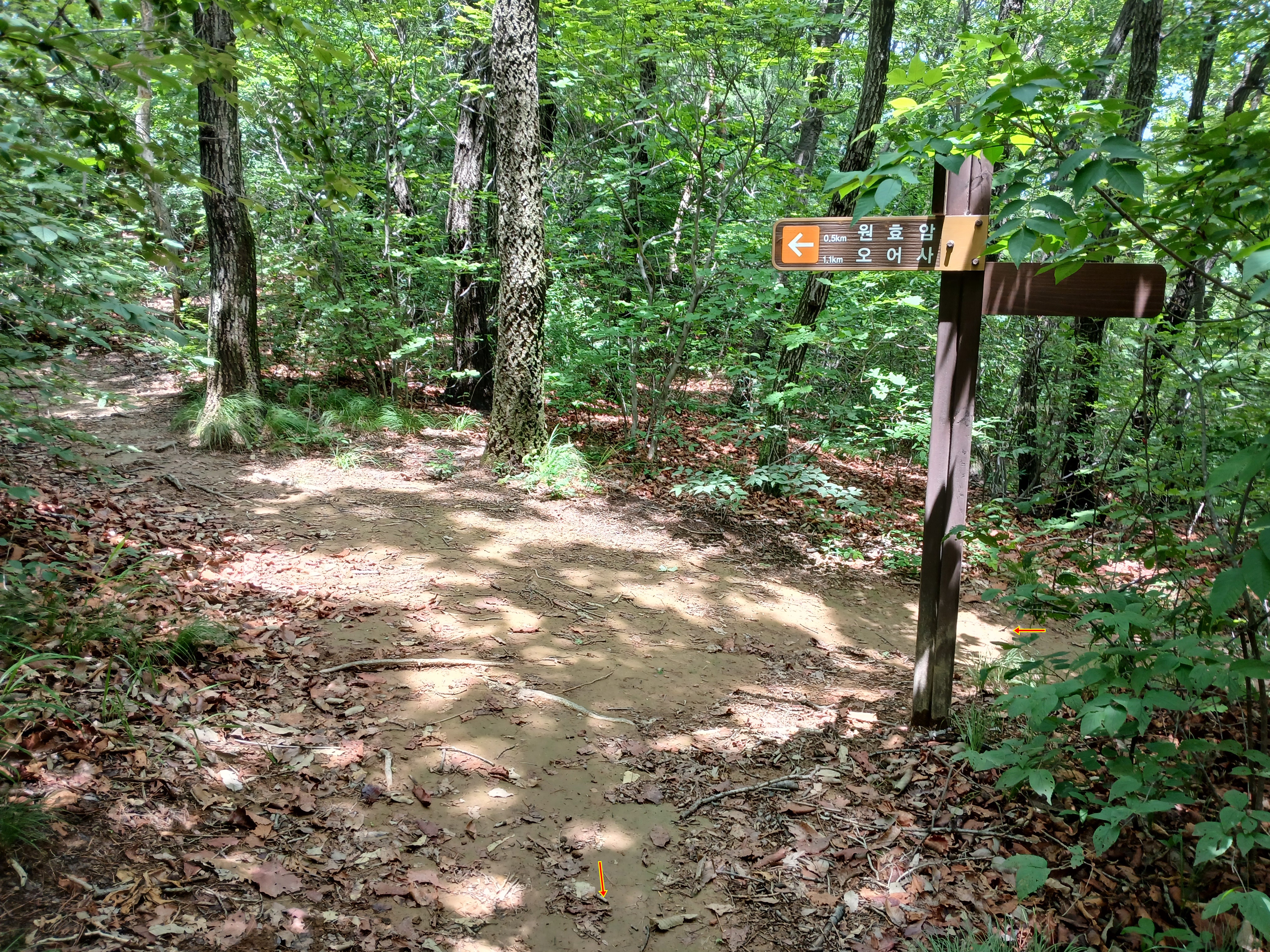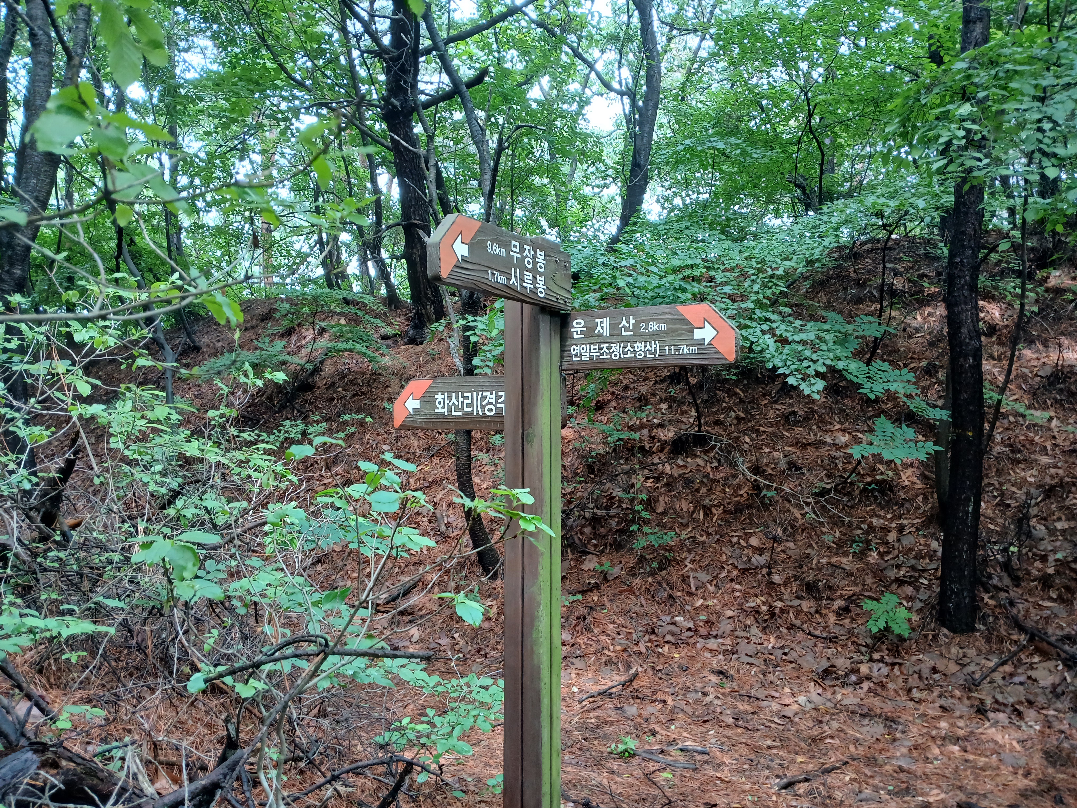 코스:오어사-자장암-산여산불감시초소-대각리갈림길-대왕암갈림길-대왕암(빽)-운제산-시루봉갈림길-홍계리갈림길-화산리갈림길-동자봉-망뫼봉-시루봉(빽)-산여고개-내나무(소나무)-운제봉중봉(헬기장상)-헬기장(하)-원효암-오어사