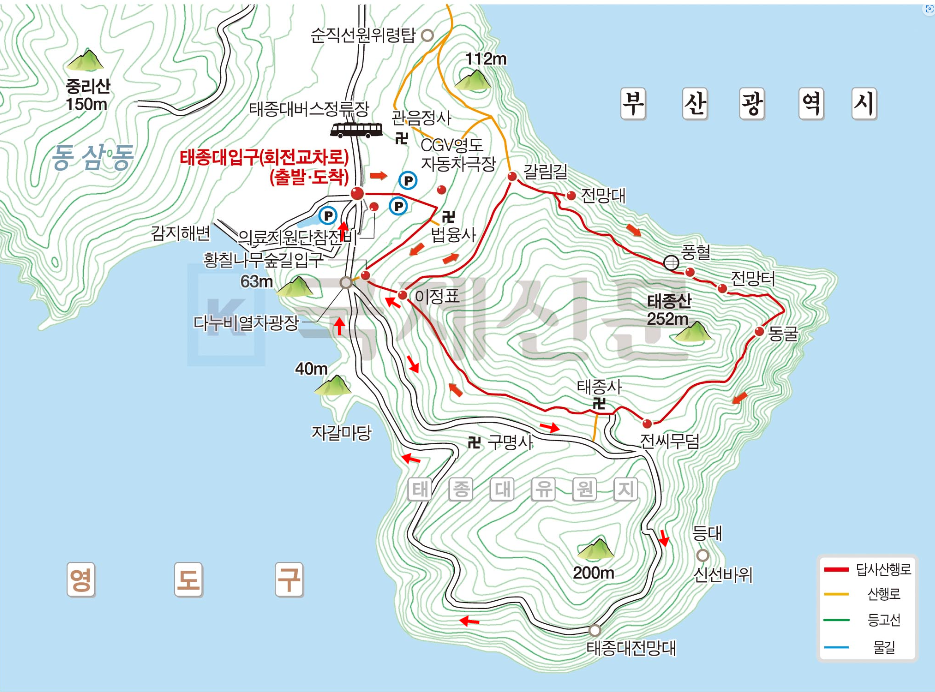 코스:태종대교차로-법융사-철책길-풍혈-군부대-태종사-태종대순환로-시민헌장비-영도등대입구-태종대전망대-유람선선착장입구-다누비열차승차장-태종대교차로