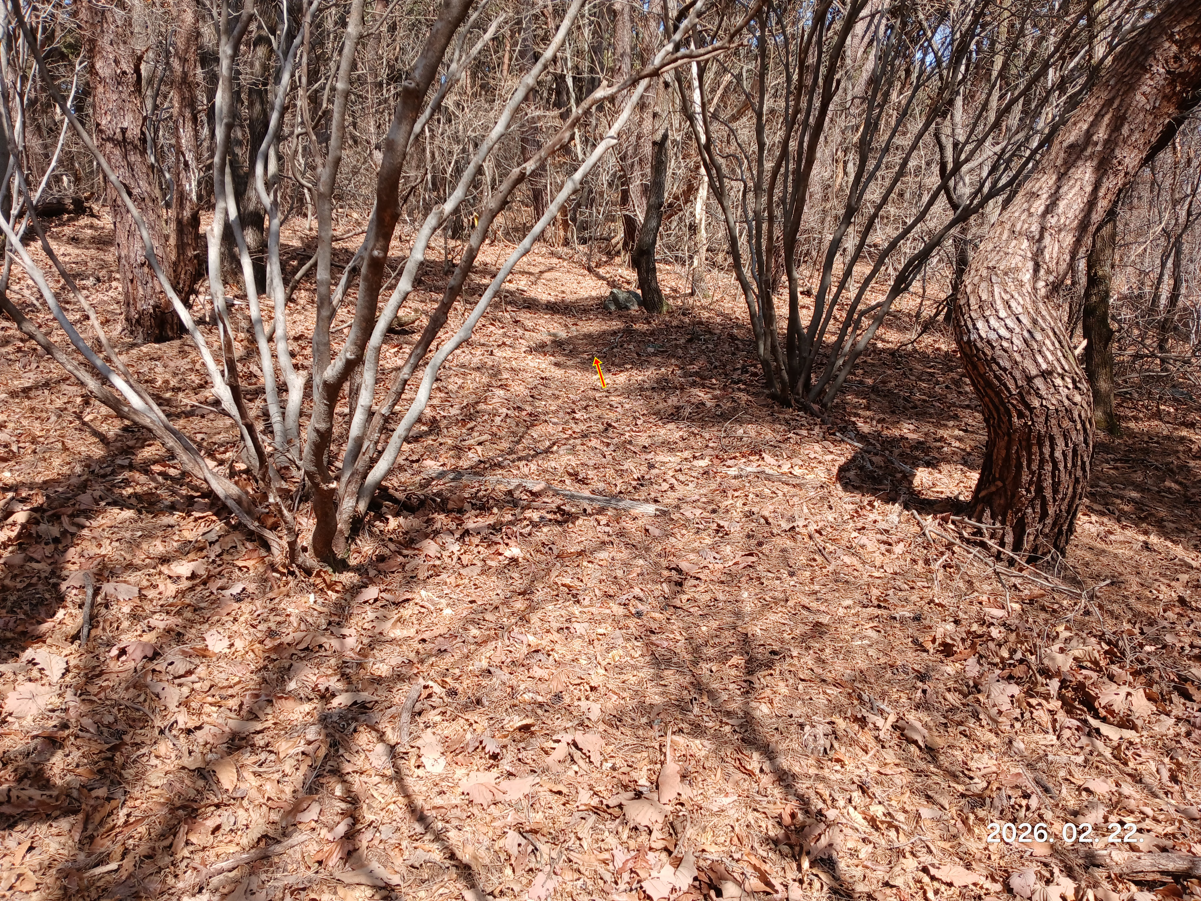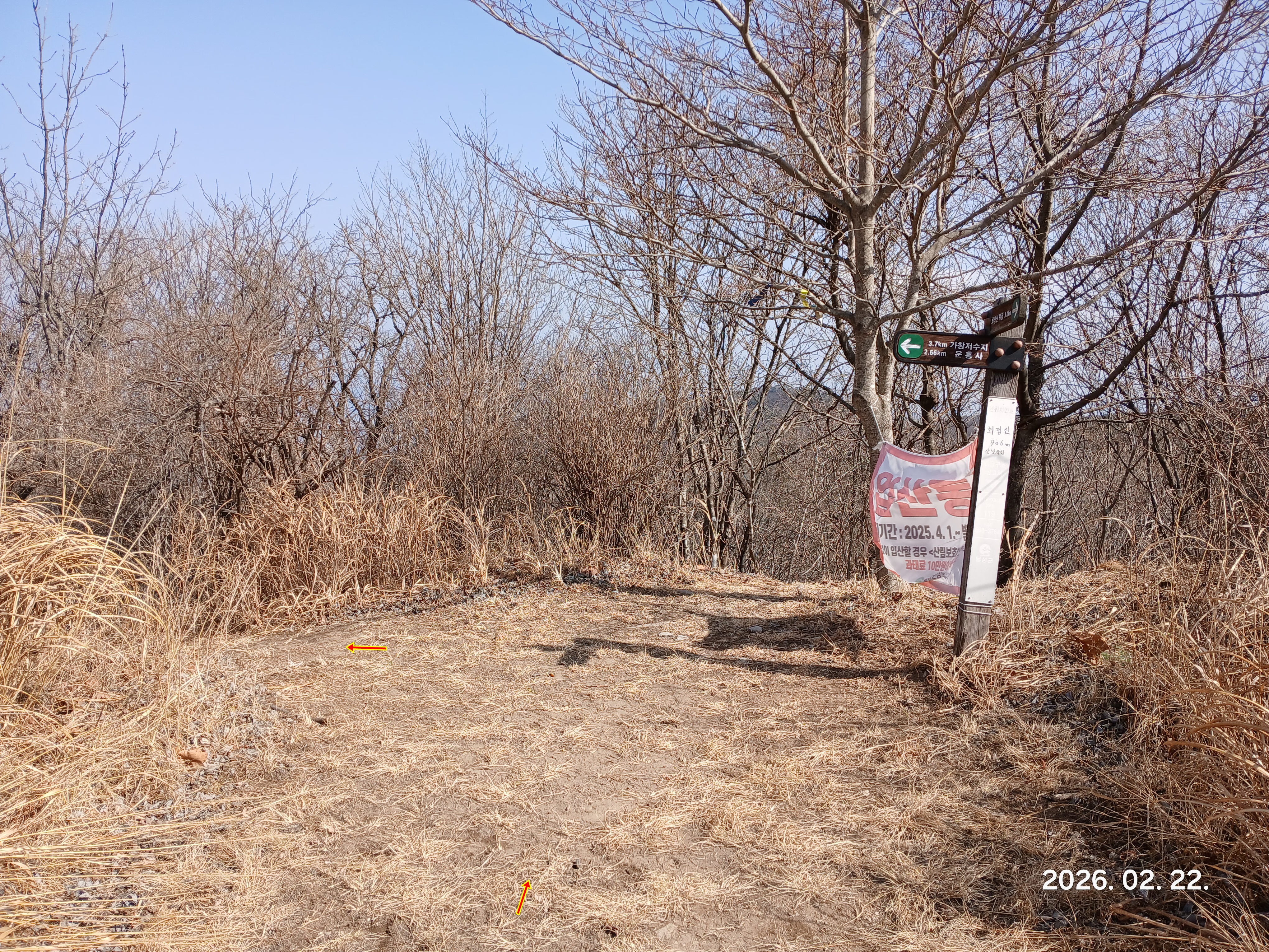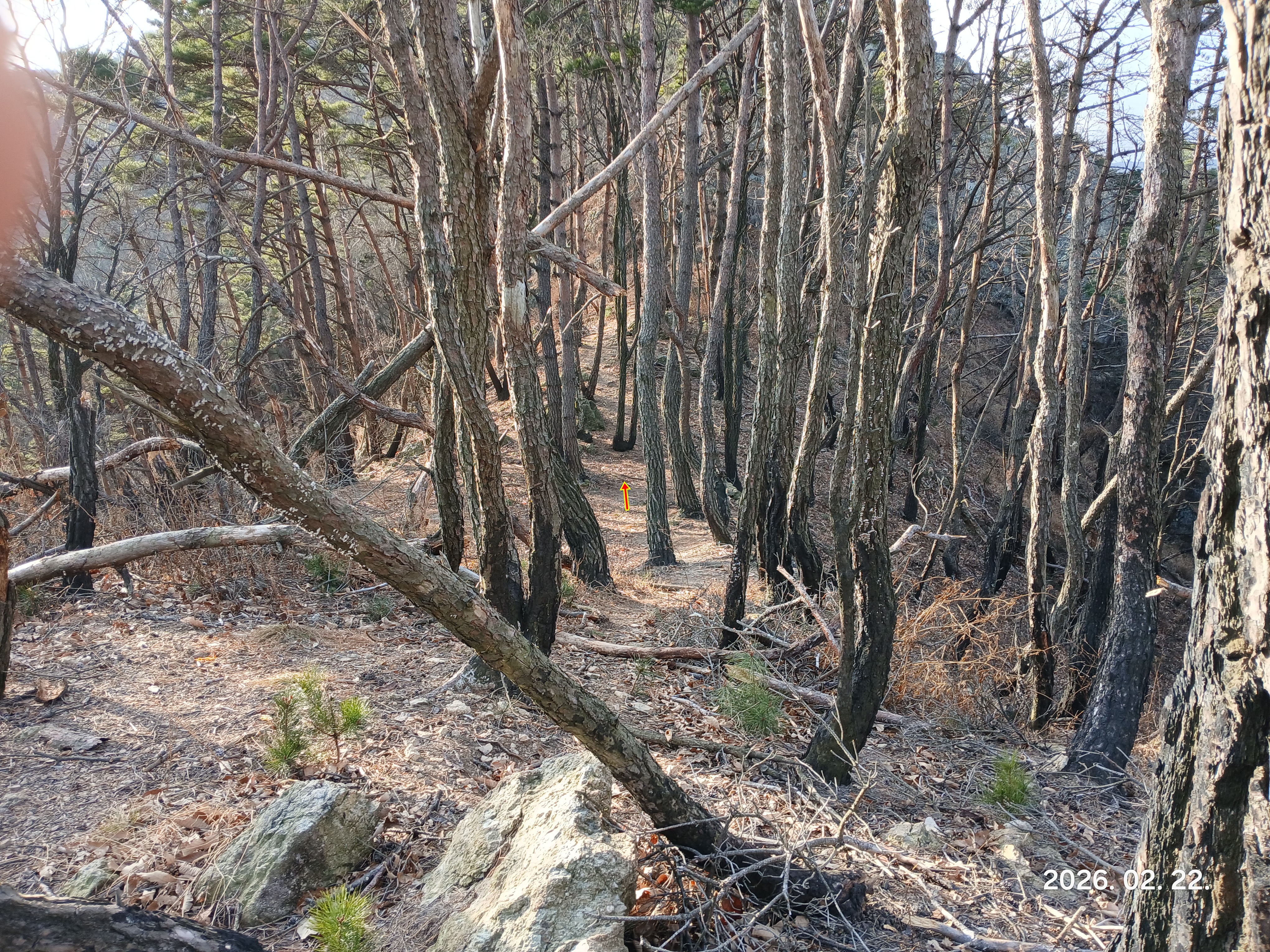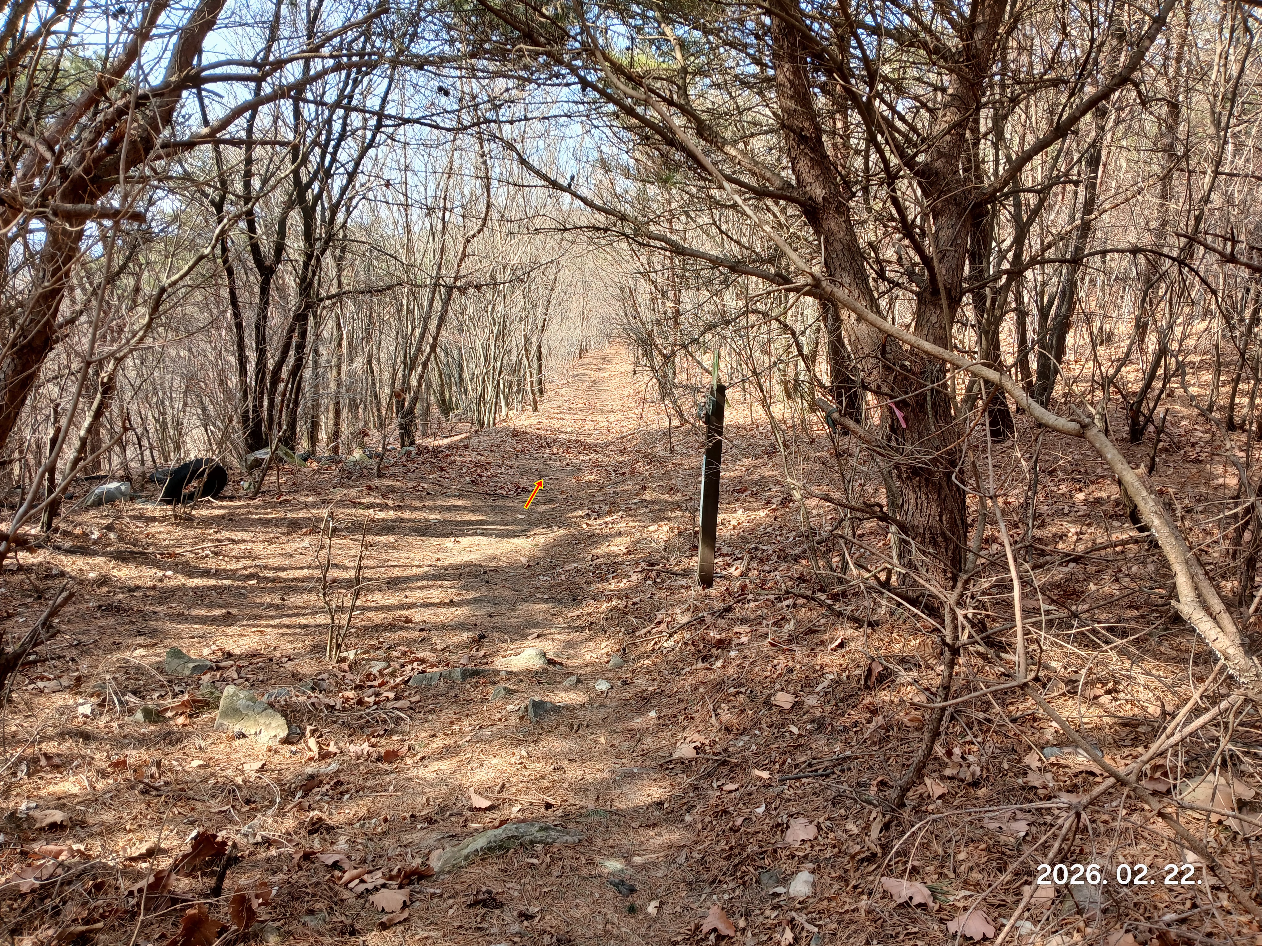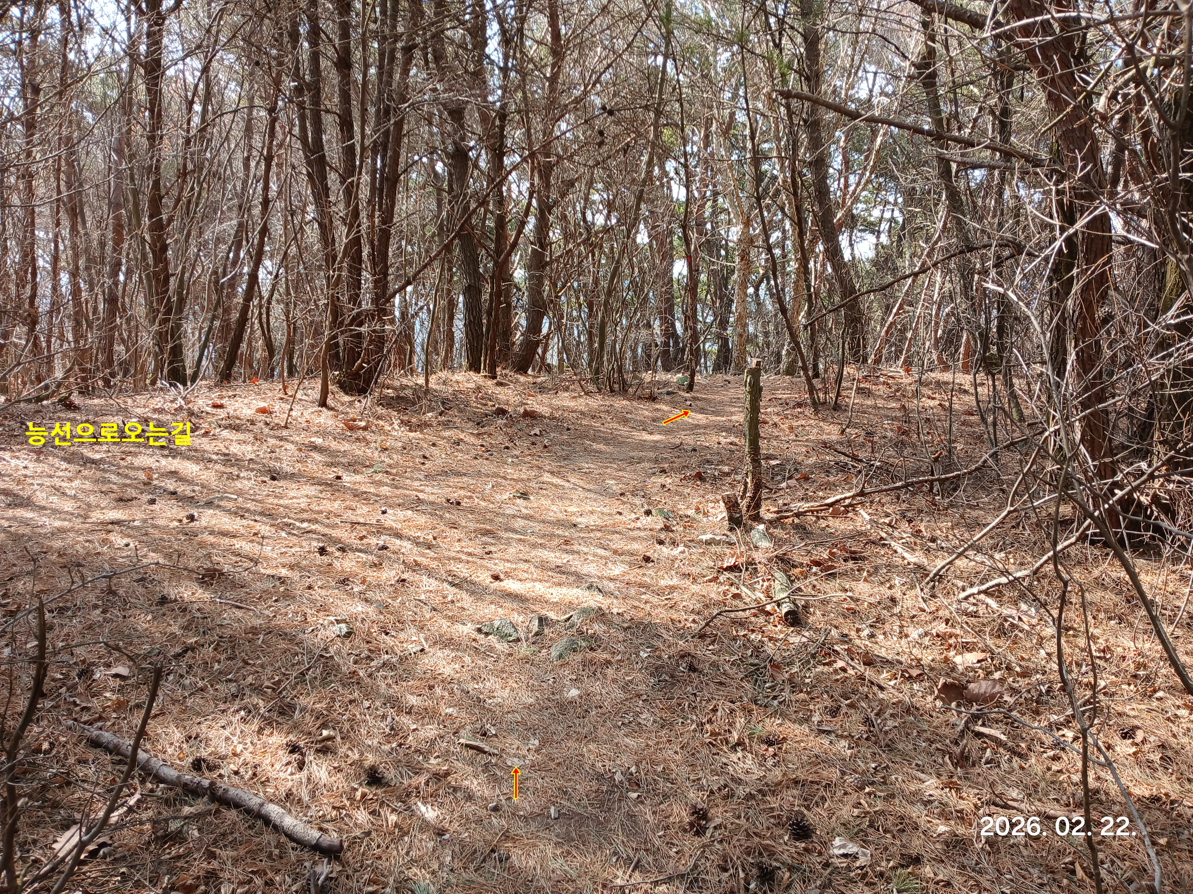 ↓능선길 다음에 갈림길이 우 직진 하여야 하는데 우측으로 등로가 거의 보이지 않아 지도 검색을 통해 현위치를 확인후 지도상 등로로 진행 하여야 한다