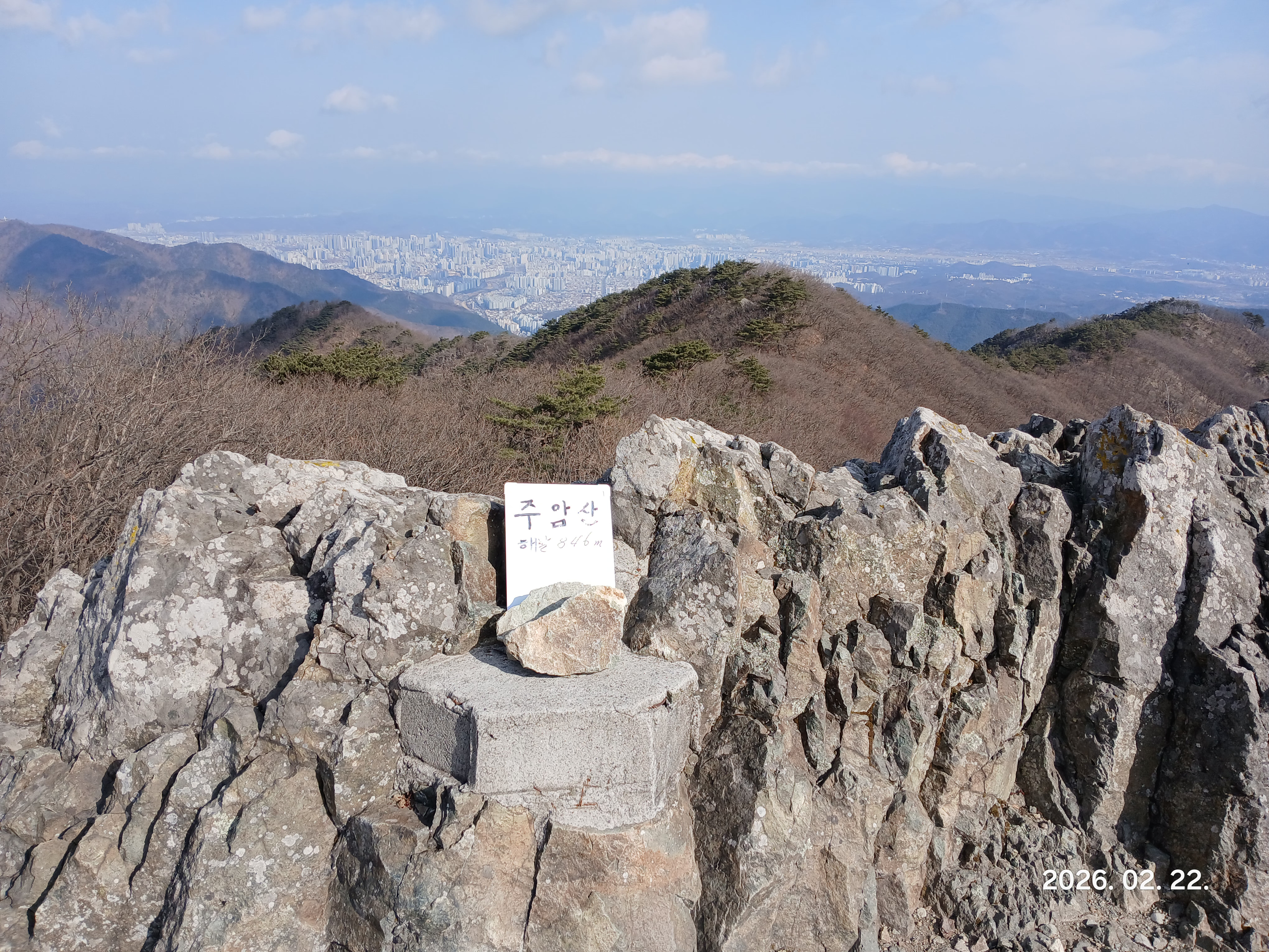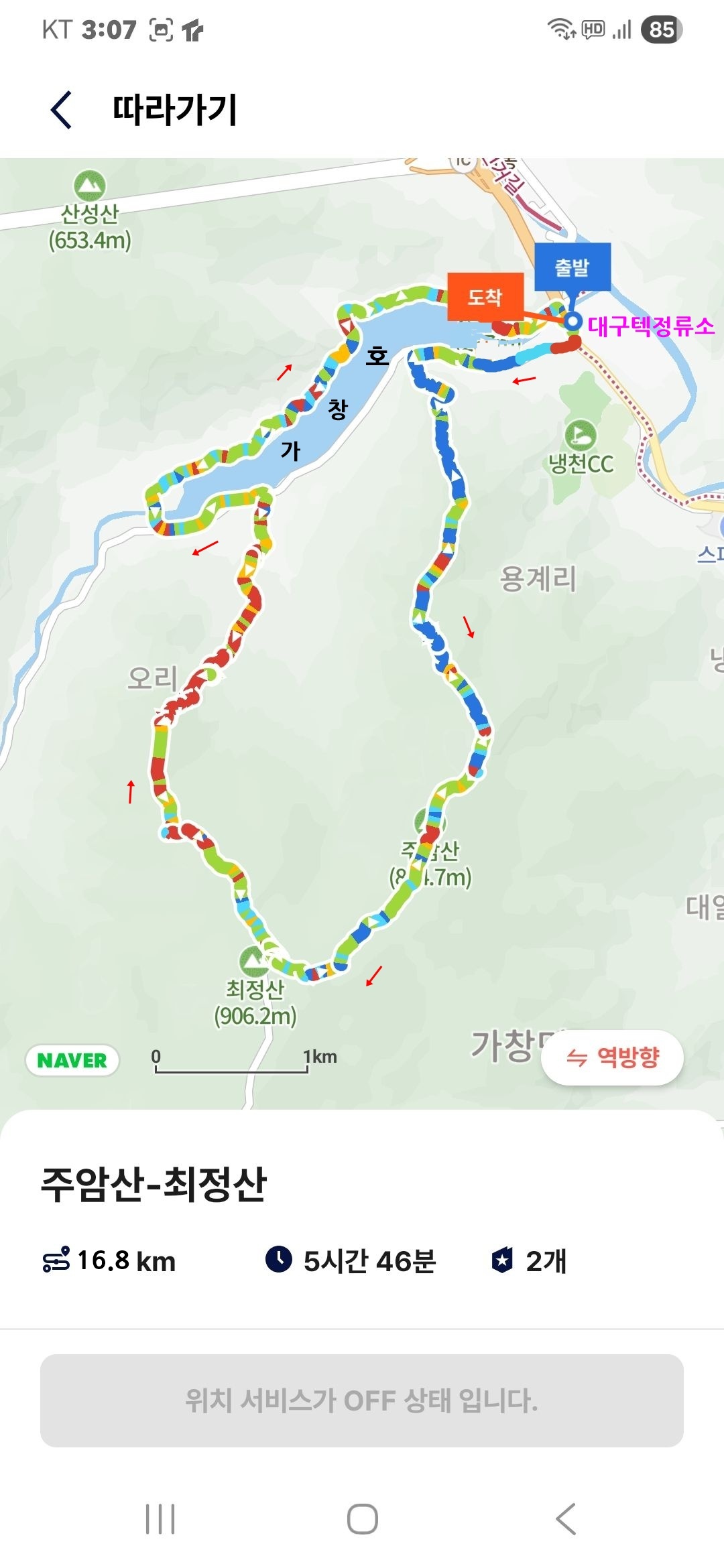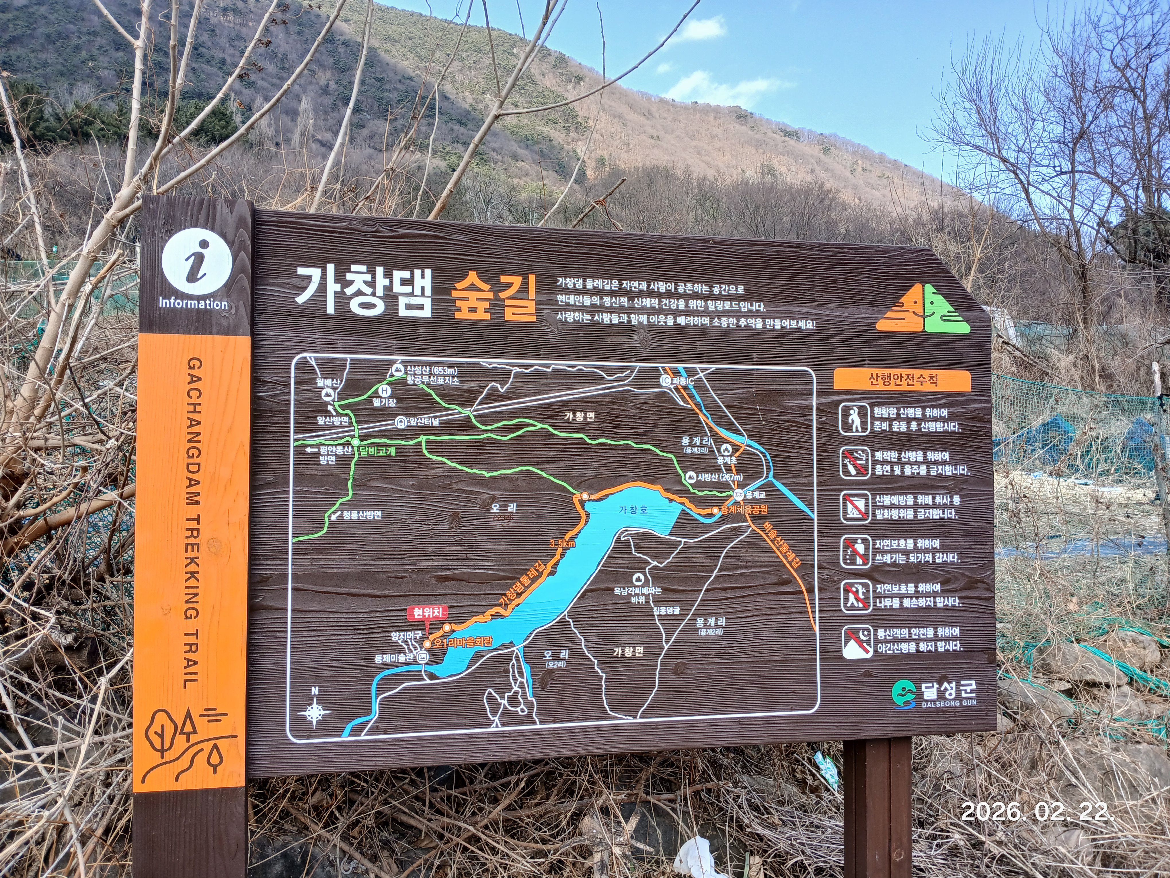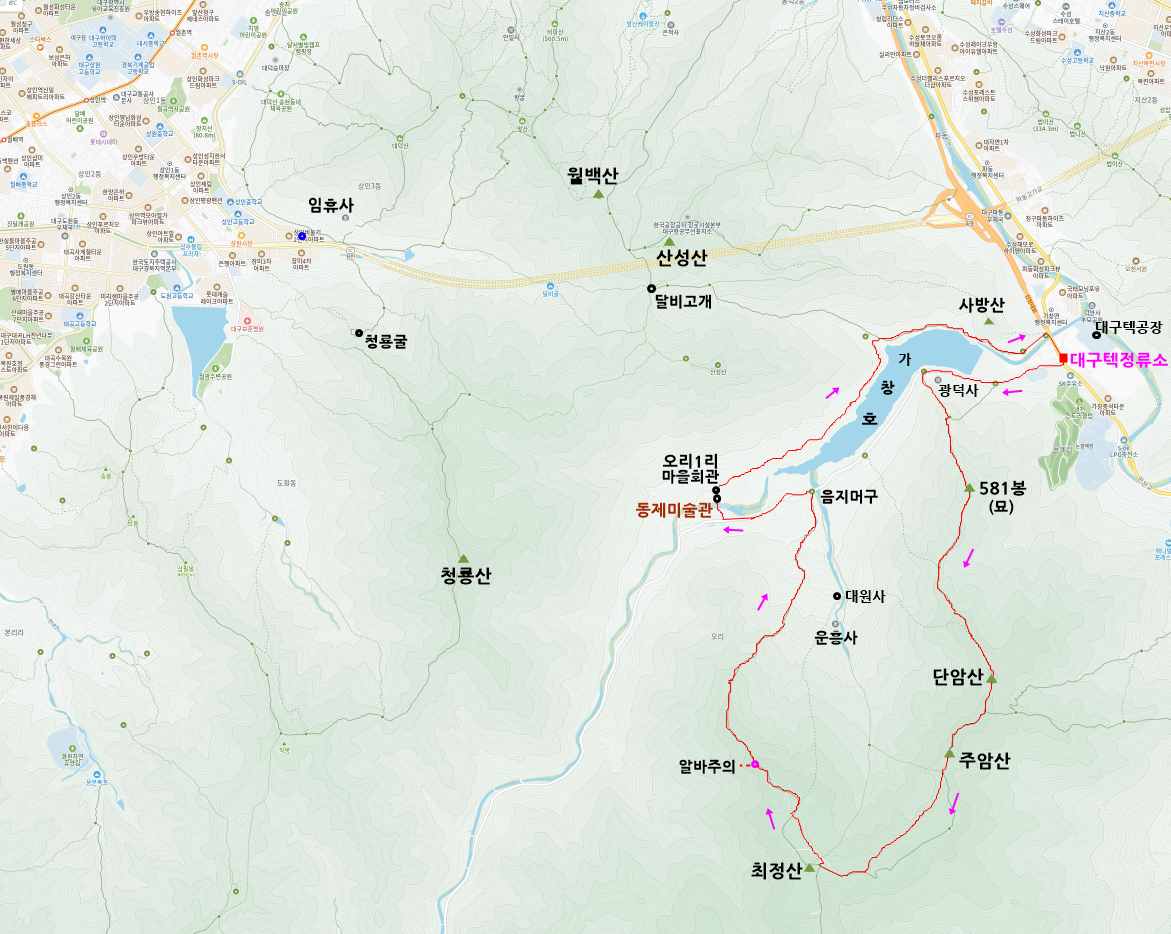 코스:대구텍정류소-가창호-광덕사-581봉(묘)-단암산-주암산-분지사면길-최정산헬기장-운흥사갈림길삼거리-능선봉우리-681봉삼각점-임도-가족묘-오2리마을회관-음지머구안내석-가창호둘레길-동제미술관-가창댐숲길안내도-달비고개갈림길-용계체육공원-대구텍정류소