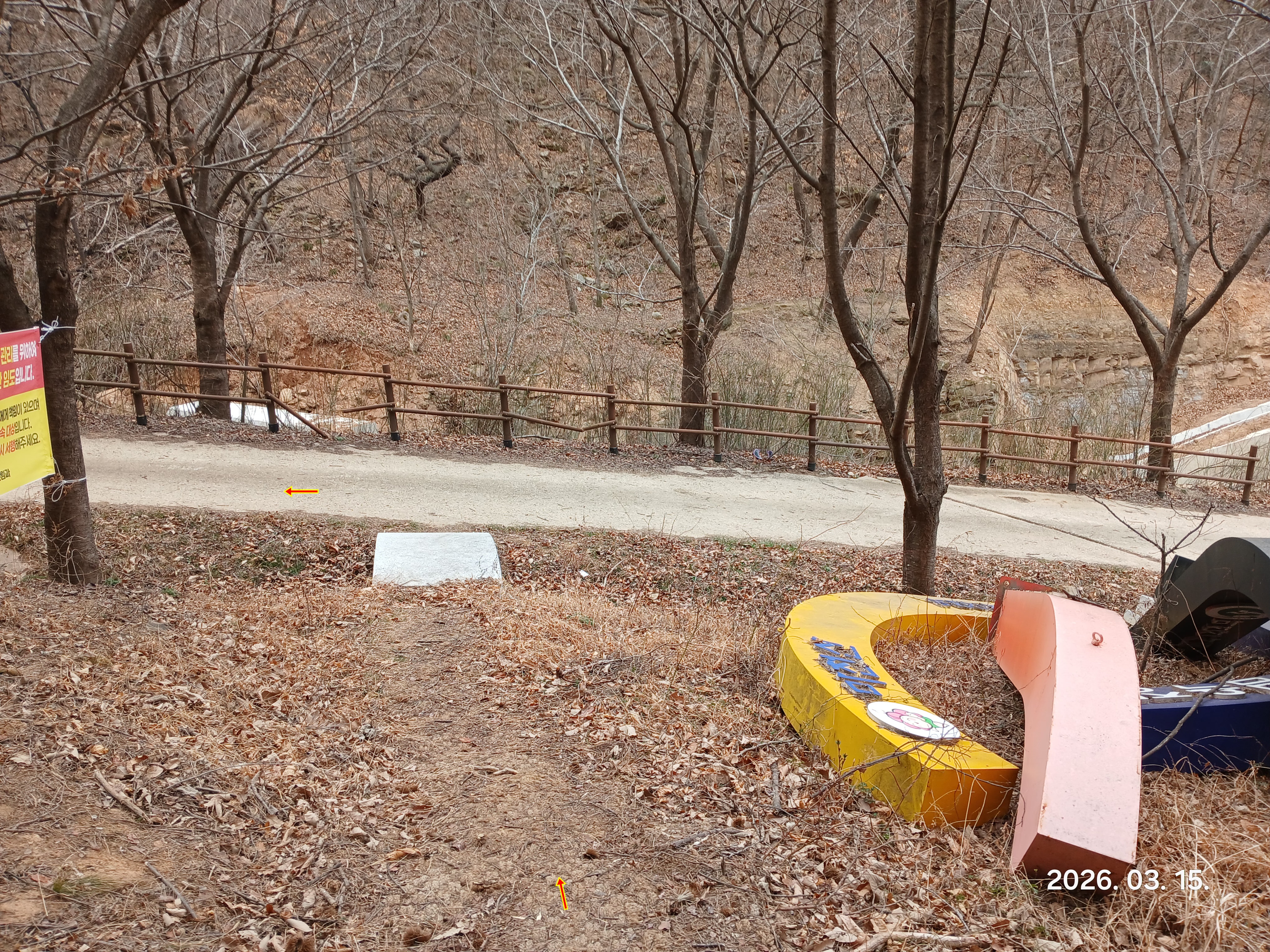 ↓임도로 올라오다가 배수로가 있는 이곳에서 우측 팬스를넘어 계곡으로 내려간다(이곳이 성산으로 올라가는 등로였지만 팬스로 막아놓아 길이 없어졌으나 자세히 보면 등로가 남아있다 ※여름 성수기에는 숲이 우거져 길찾기가 어려울수도 있으니 임도로 돌아서 서재문양길 임도 고개에서 성산을 갔다오면 된다 왕복800m 거리이다)