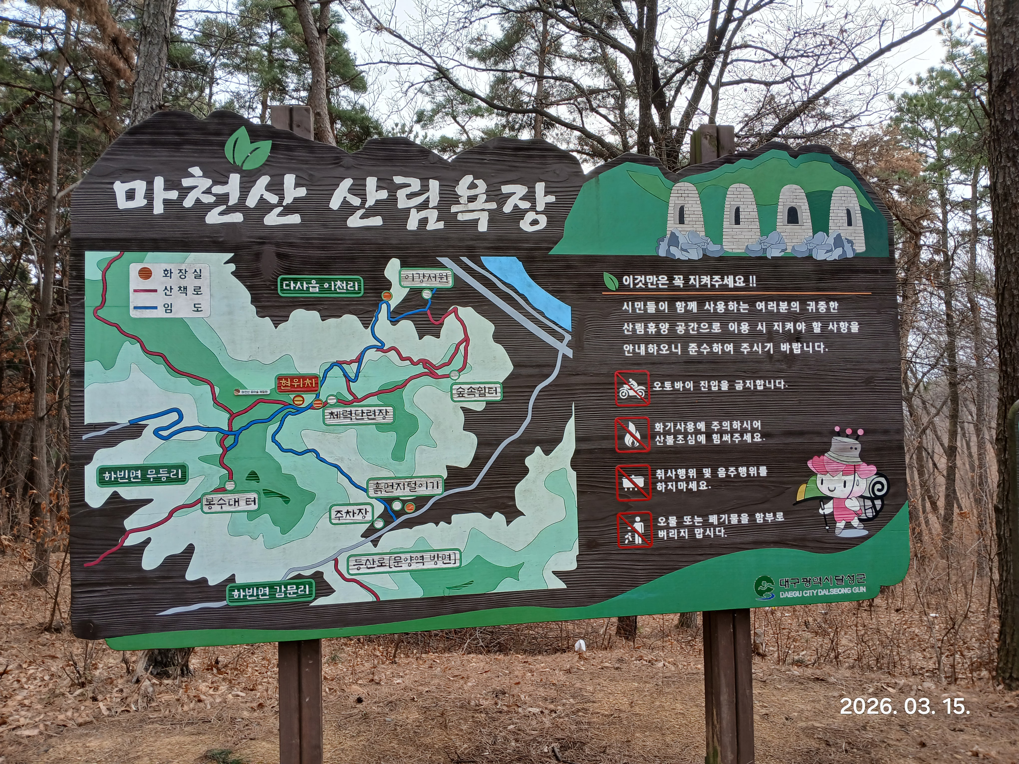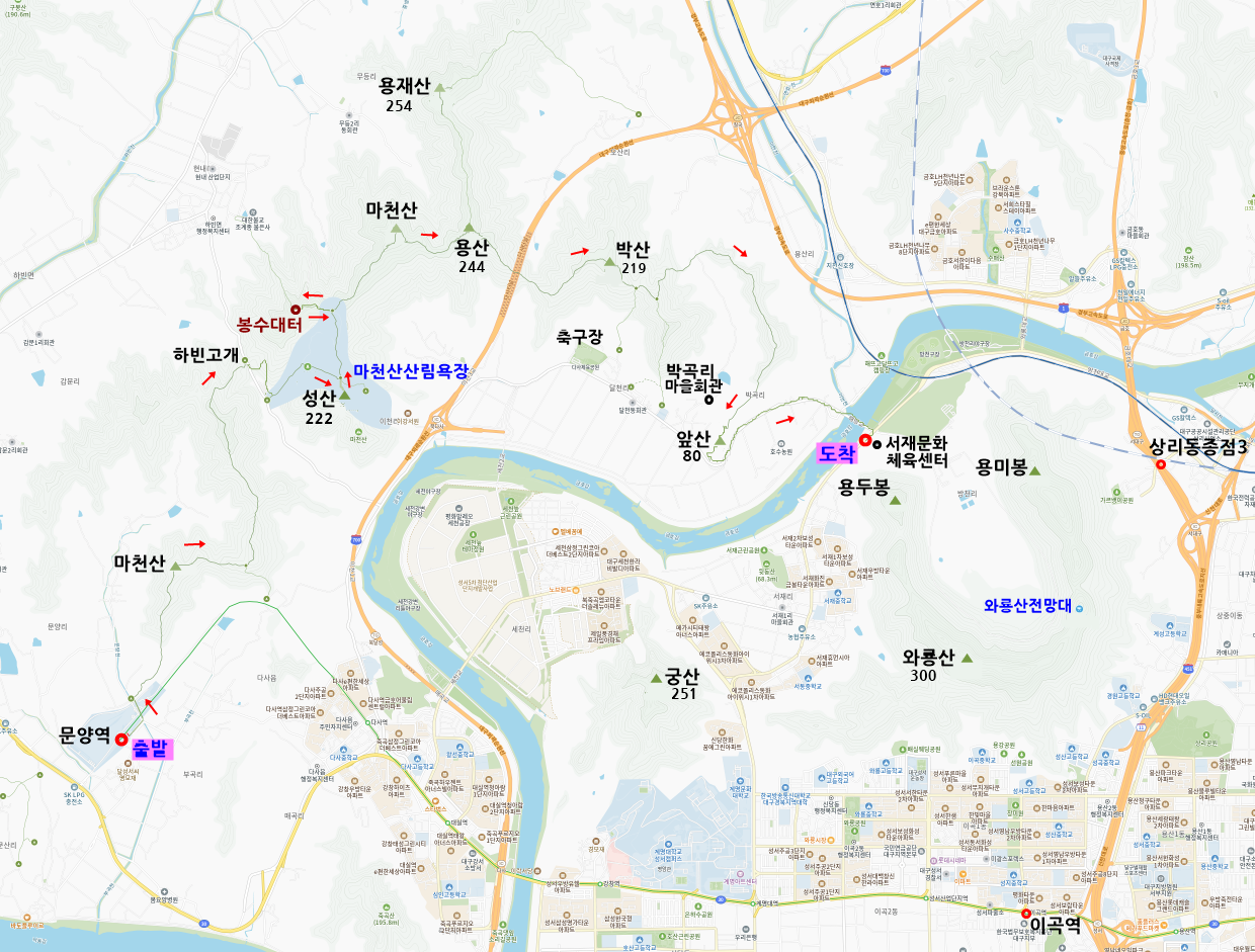 코스:대구지하철2호선종점문양역-마천산-대나무숲-부곡배수지갈림길-마천산산림욕장갈림길-하빈고개-봉수대터갈림길-산림욕장임도-계곡-성산(빽)-서재문양길오거리-봉수대터(빽)-마천산-용산-박산-과수원-능선길-능선운동시설-앞산-다사로-법성사-해랑교-서재문화체육센터건너정류소