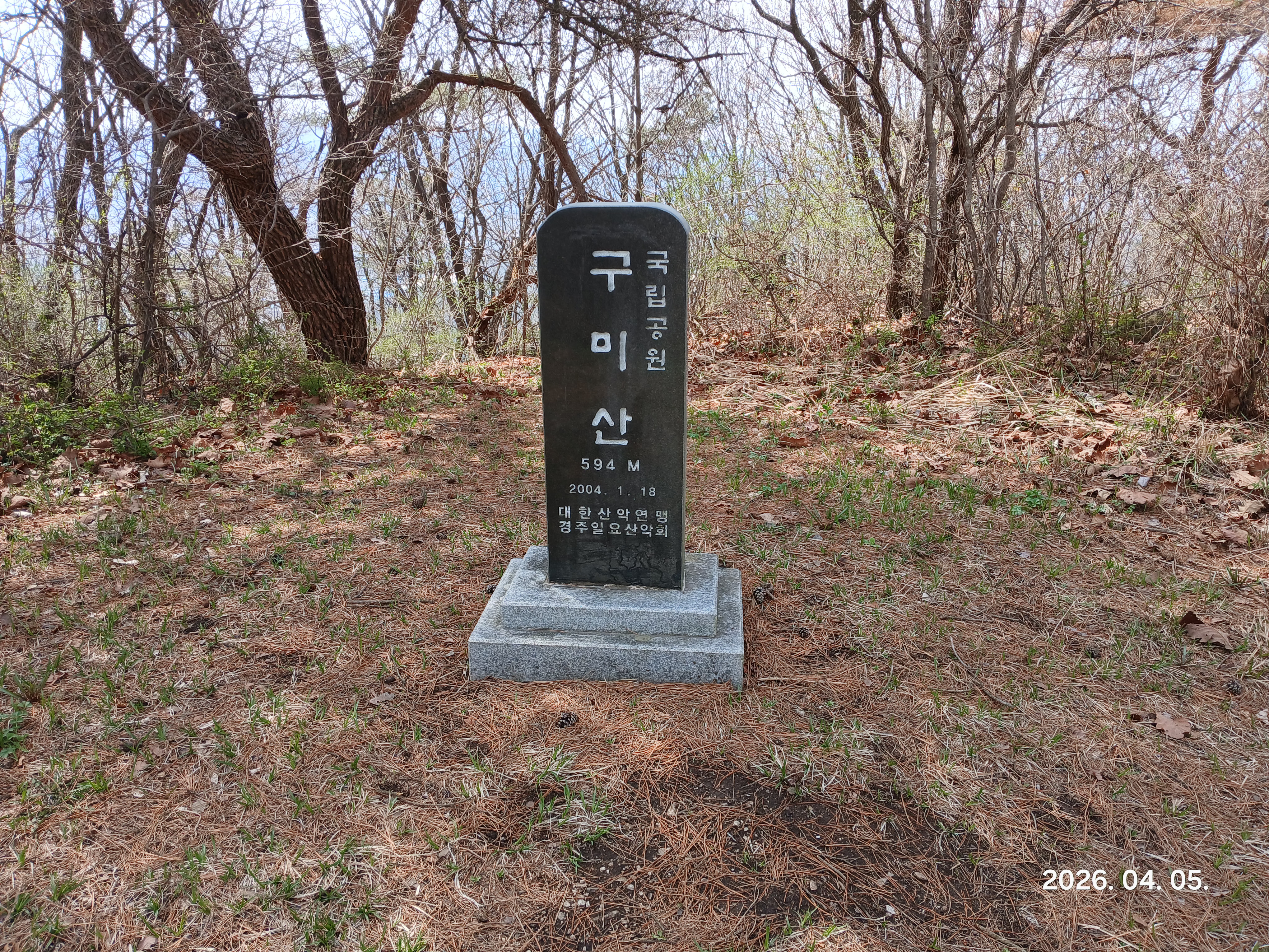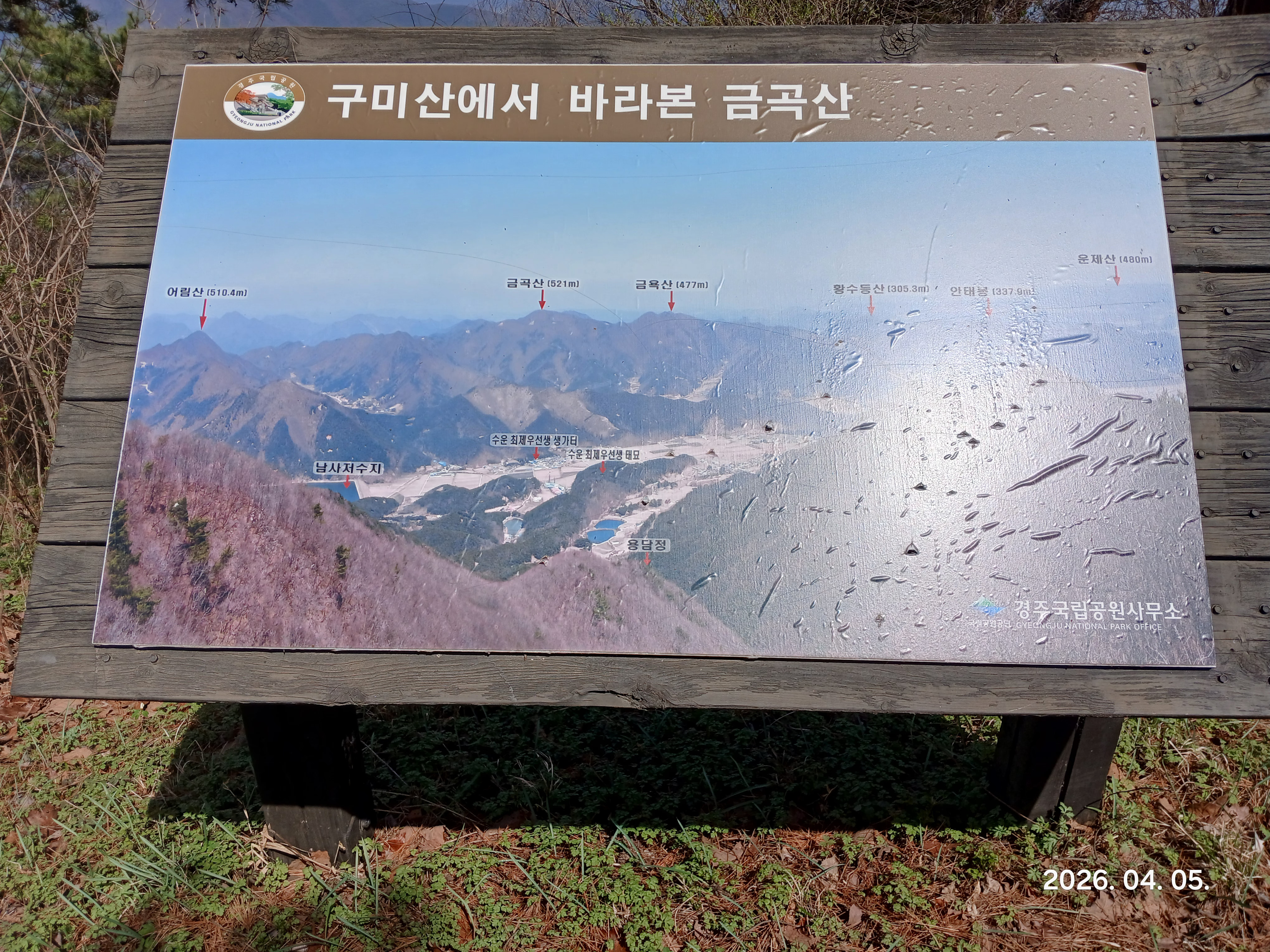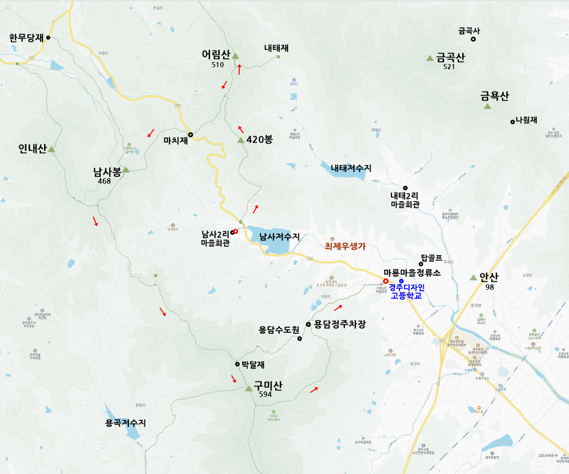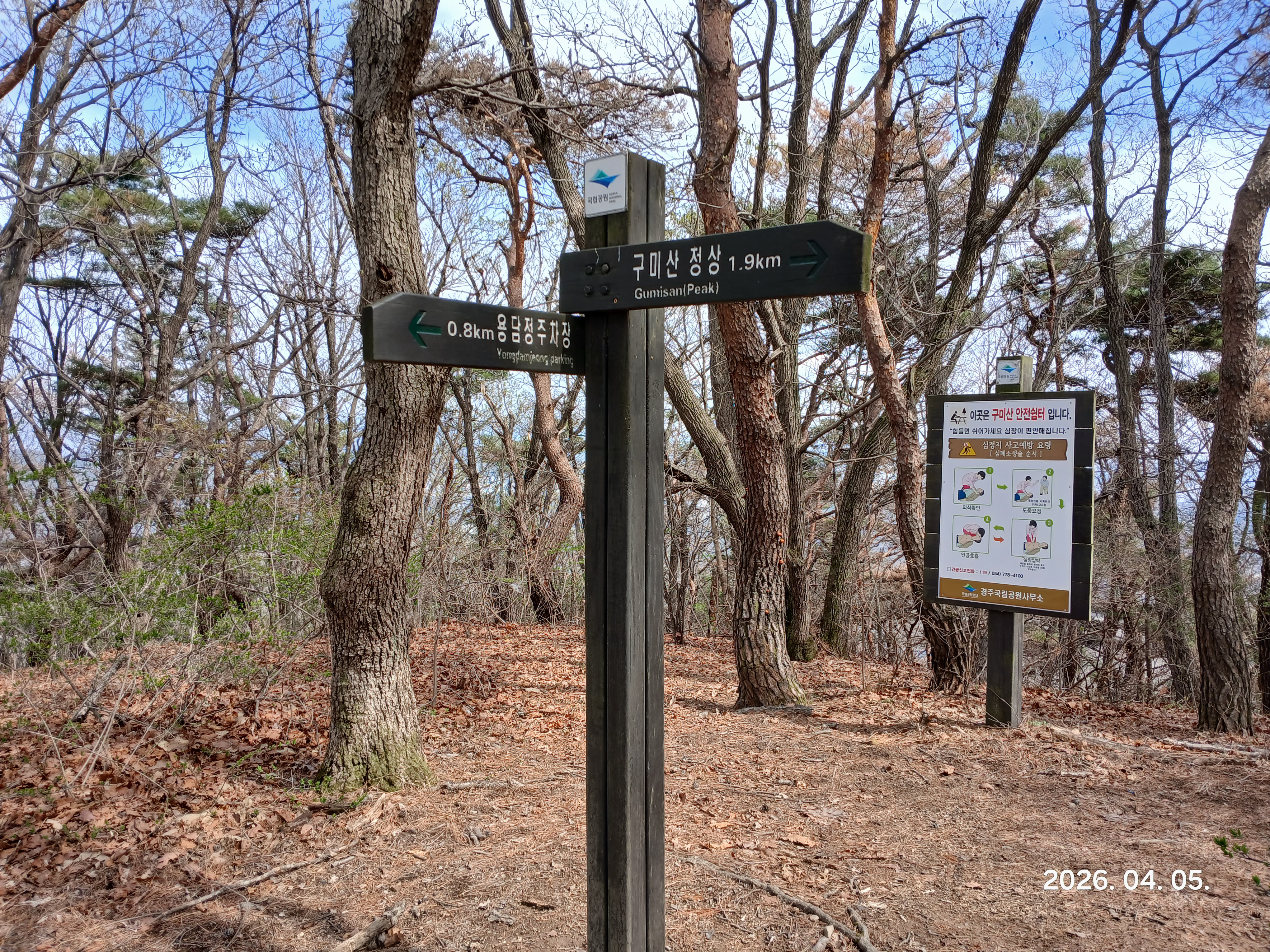 코스:남사2리마을회관-능선-420봉-낙동정맥능선합류-어림산(빽)-마치재-파크골프장-남사봉-520봉삼각점-산불감시초소-능선길-박달재-구미산-용림산갈림길삼거리-능선-용담정주차장-가정3리마을회관-마룡마을정류소